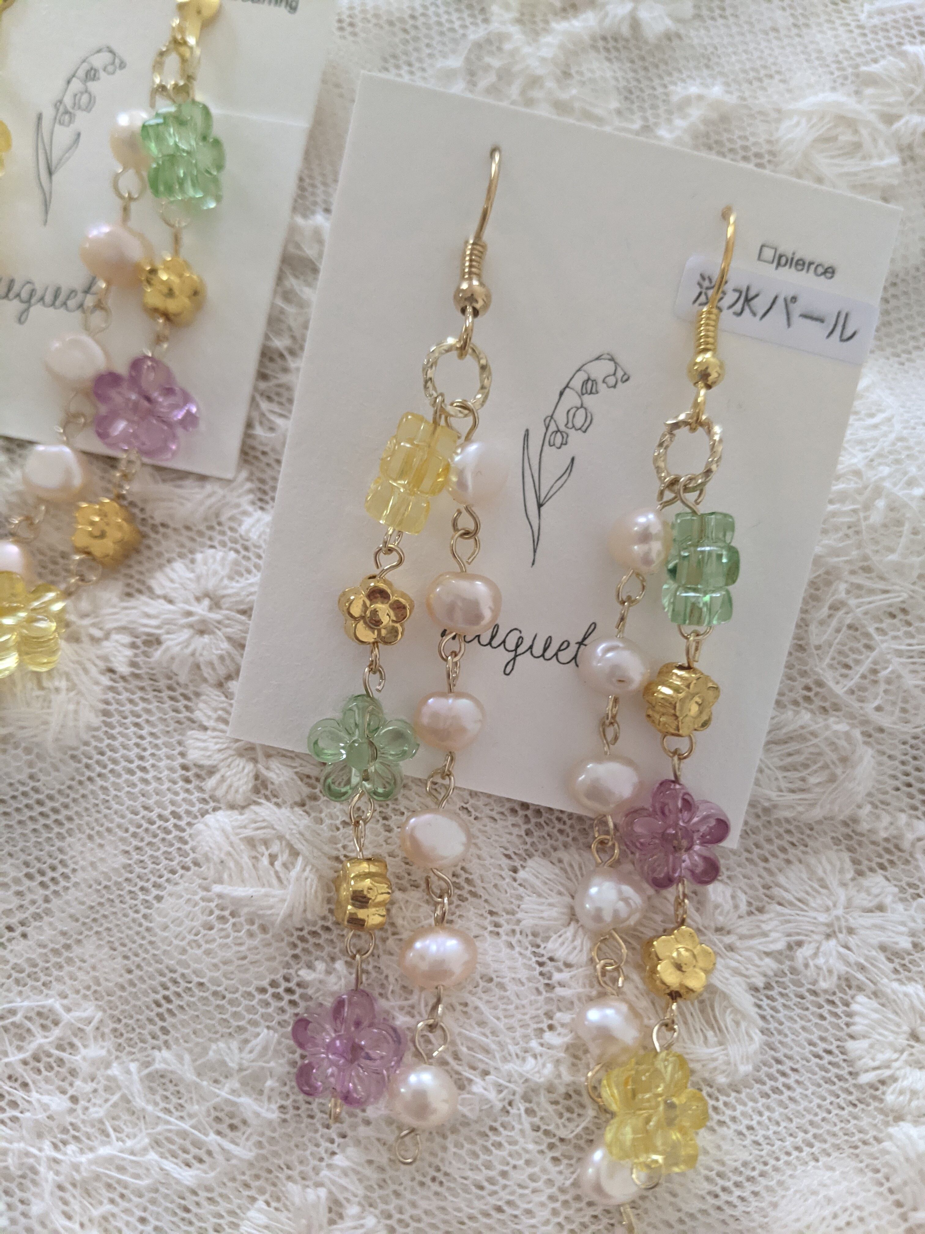 キャンディみたいな色合いがかわいいクリアのお花のビーズと淡水パールを組み合わせました。